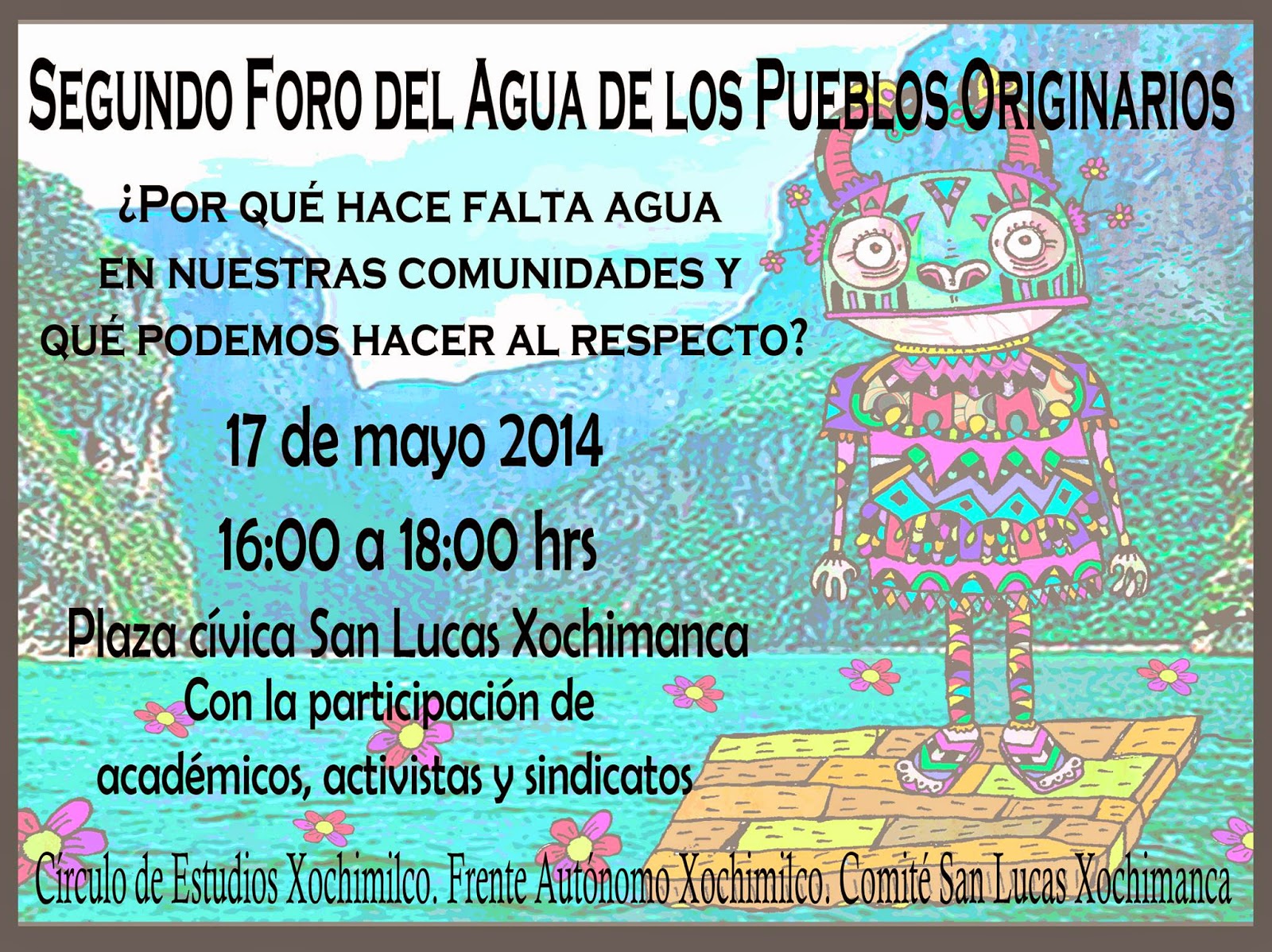 LOS INTEGRANTES DEL COMITÉ SAN LUCAS XOCHIMANCA, TENEMOS EL HONOR DE INVITAR A LOS PUEBLOS DE LA MONTAÑA, BARRIOS DE XOCHIMILCO, Y PUEBLOS DE OTRAS DELEGACIONES, ASISTIR A ESTE SEGUNDO FORO DEL AGUA, PARA DEFENDER NUESTRO DERECHO AL AGUA, Y CONOCER COMO EL GOBIERNO ESTA MANEJADO EL PLAN HIDRICO EN EL DISTRITO FEDERAL, ASISTIRAN PONENTES DE LAS UNIVERSIDADES, ORGANIZACIONES SOCIALES , SINDICATOS, PARA CONSTRUIR PROPUESTAS Y EMPLEAR ACCIONES EN CONTRA DE LA PRIVATIZACIÓN DEL AGUA, Y ESTUDIAR A PROFUNDIDAD LAS REFORMAS ESTRUCTURALES DEL GOBIERNO FEDERAL RELACIONADOS CON EL AGUA.
